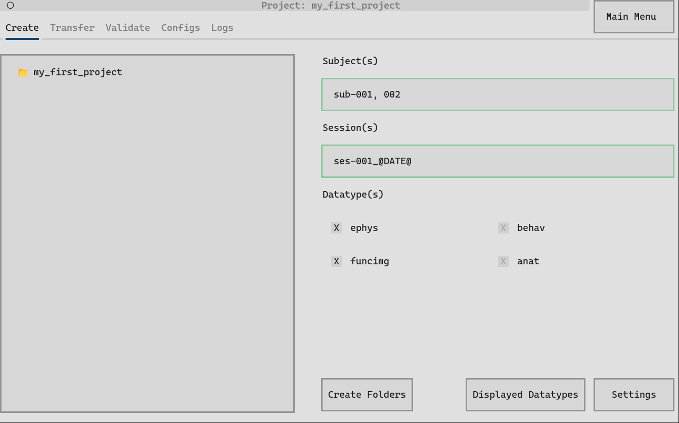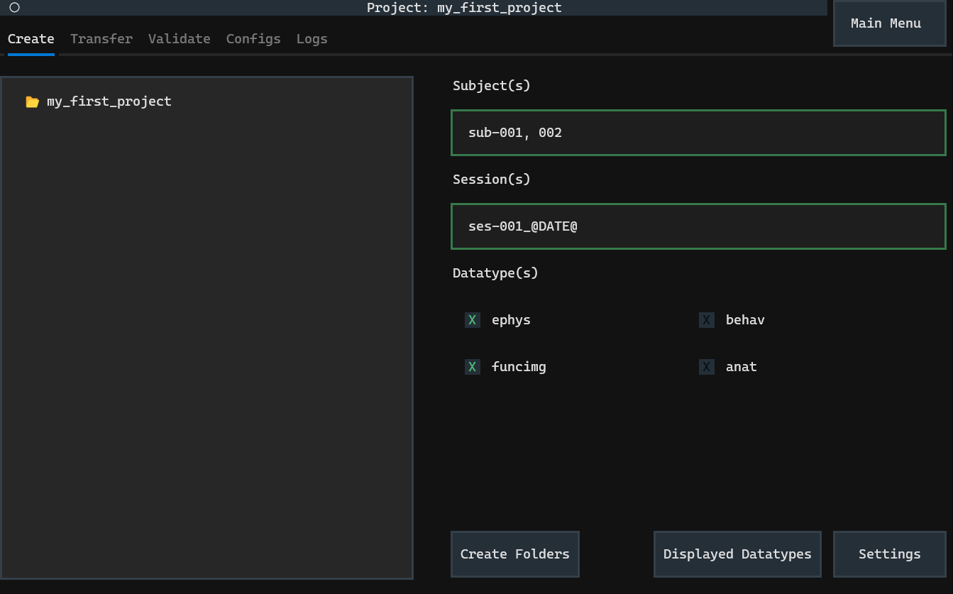 CTRL+Ais similar to ‘fill’ above, but will instead append the name to those already in the input. This allows creation of multiple subjects or sessions at once.- Open folder in system filebrowser