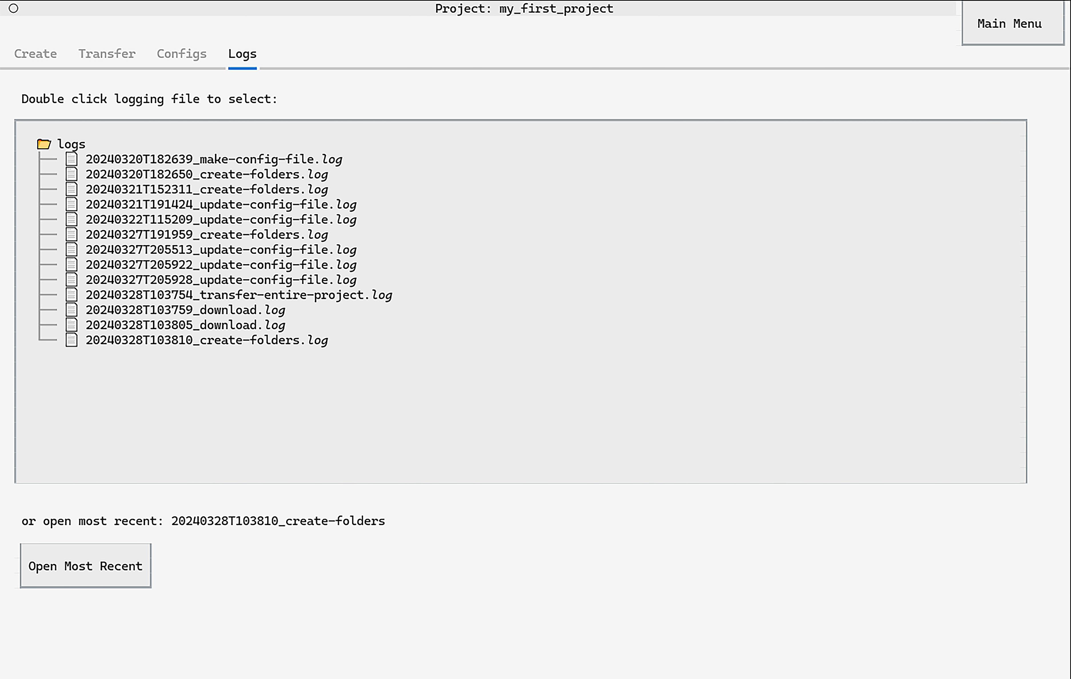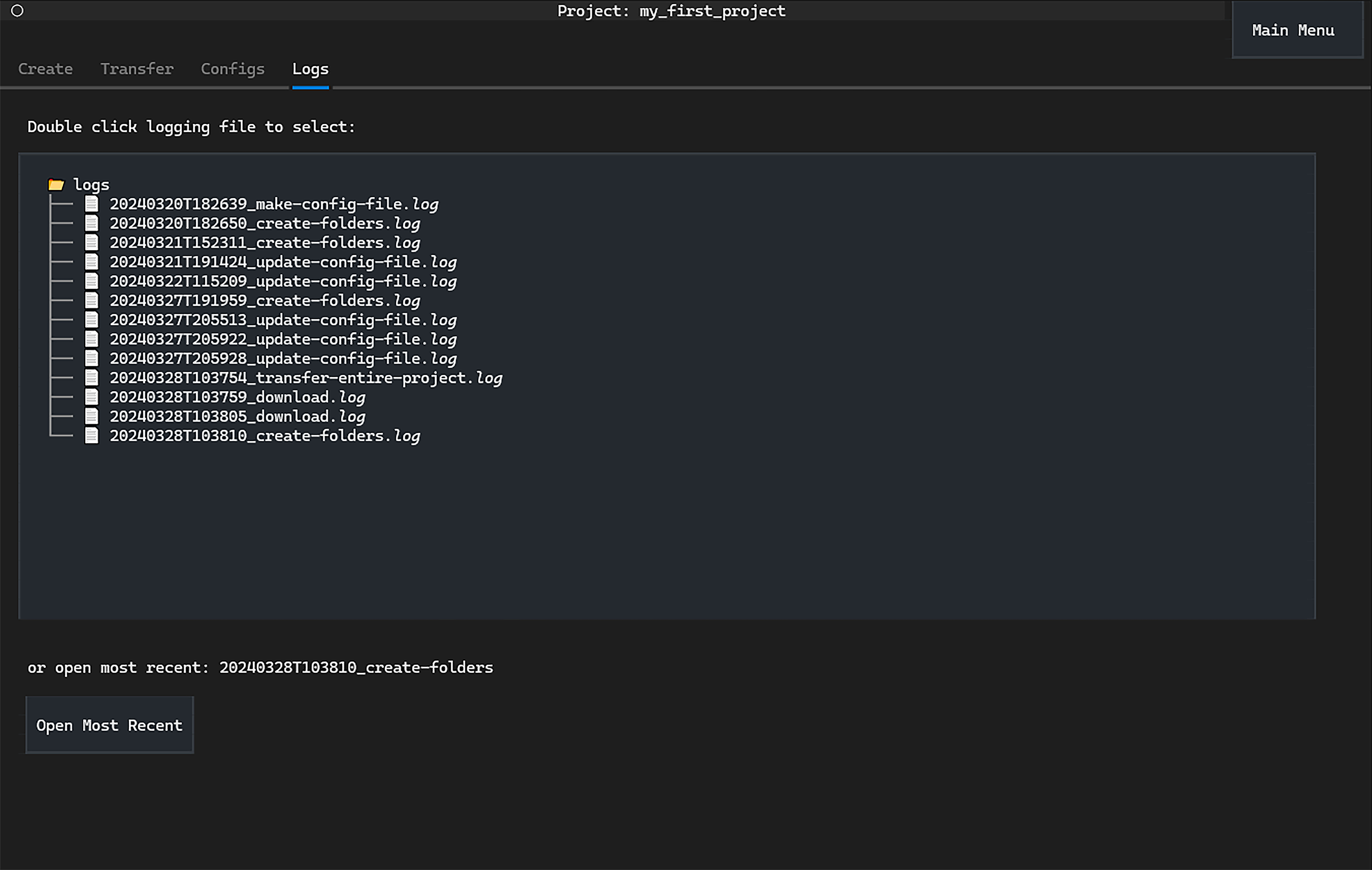 Clicking Open Most Recent will open the most recently saved logs.