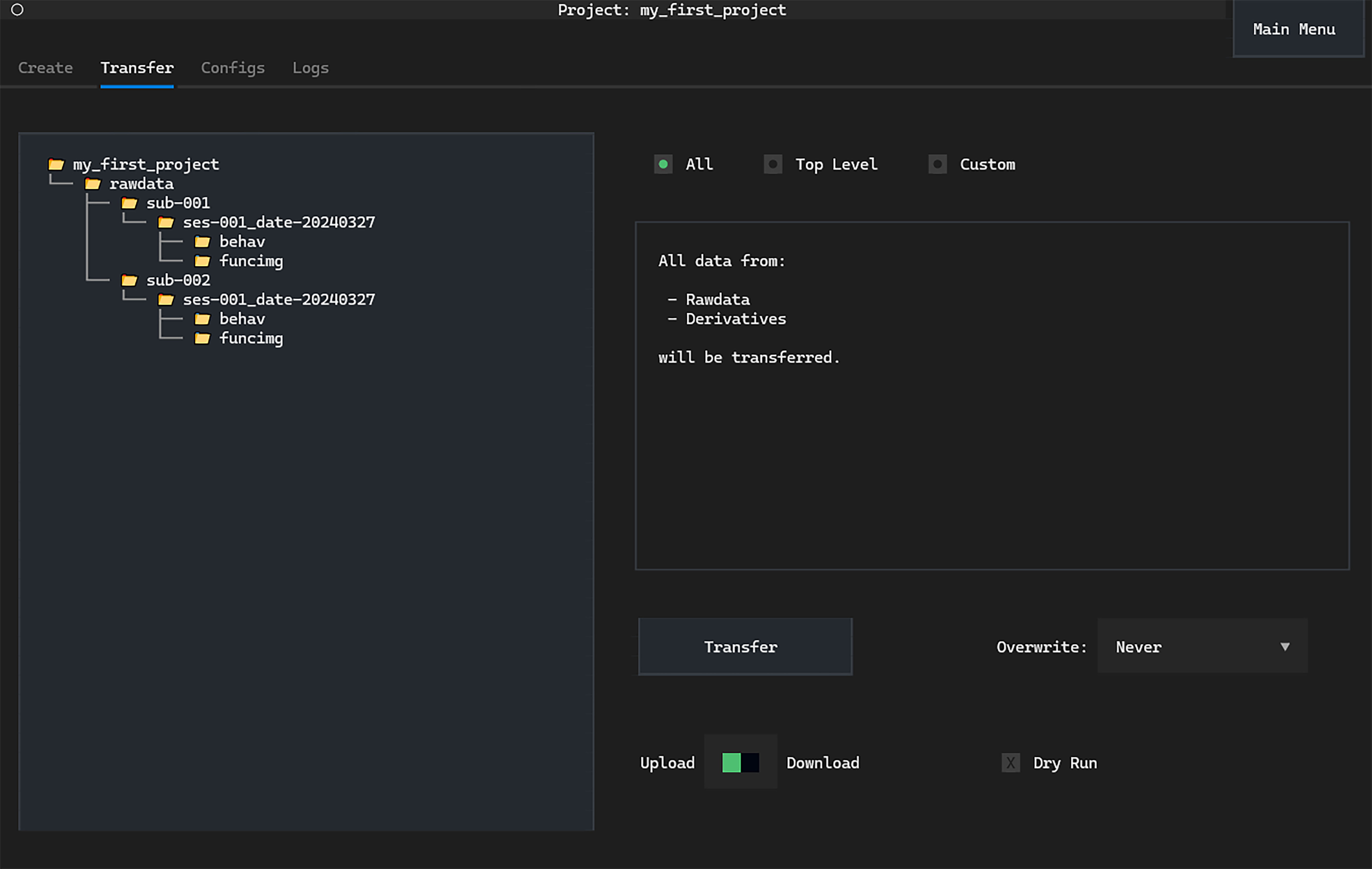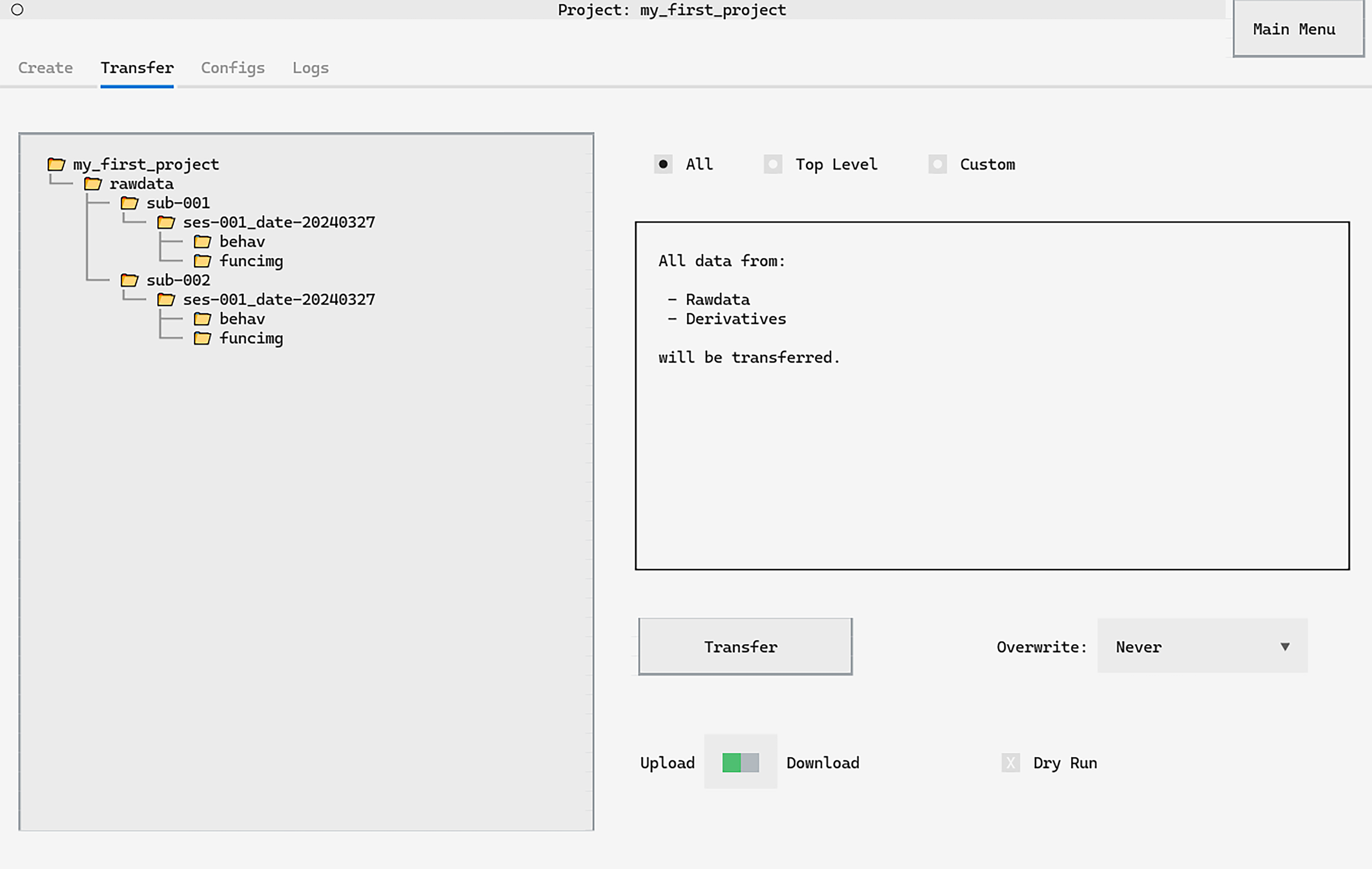 all- All files and non-subject folders will be transferred. All subject (i.e. prefixed withsub-) folders will be considered for transfer.all_sub- All subject folders will be considered for transfer.all_non_sub- All files and non-subject folders will be transferred. Subject folders will not be transferred.