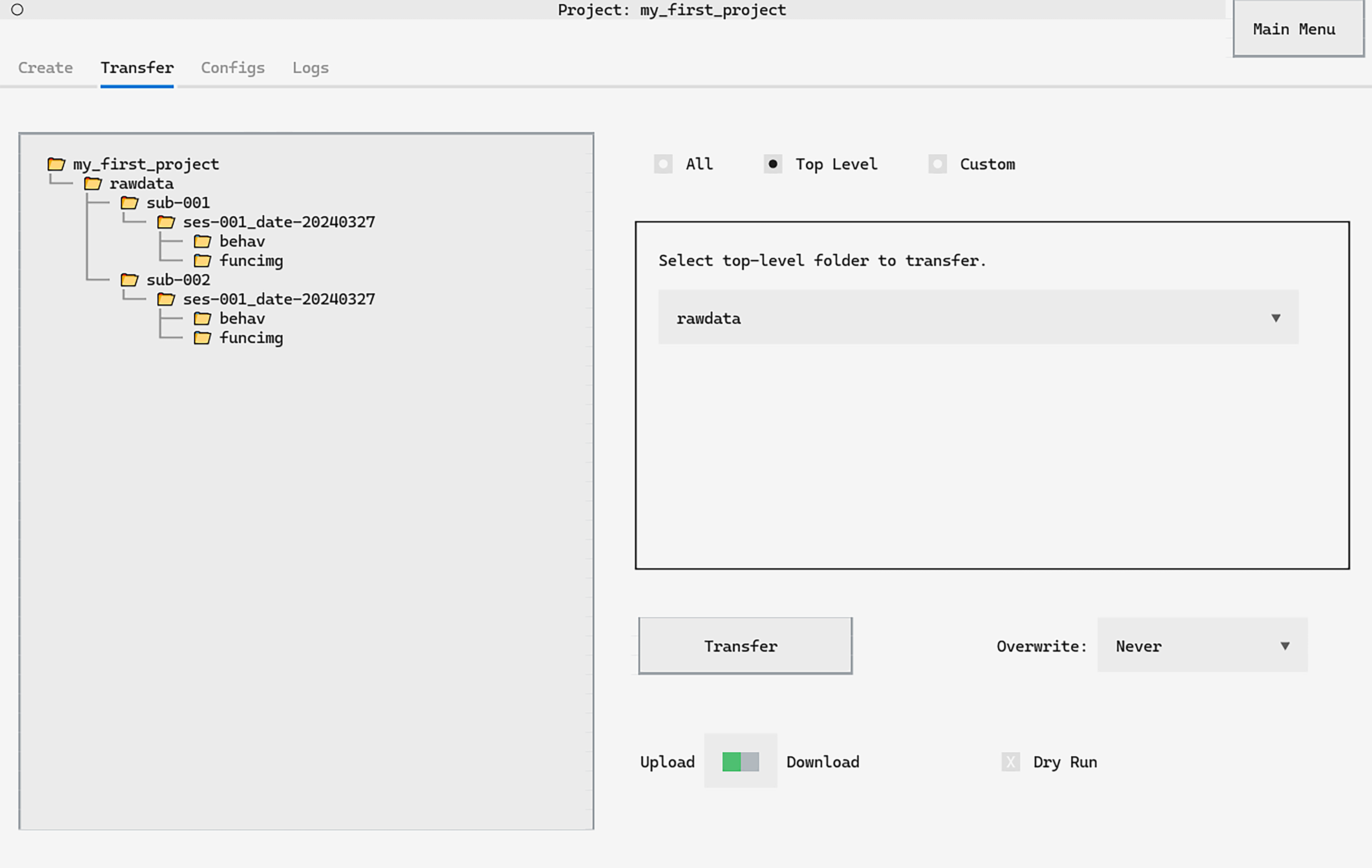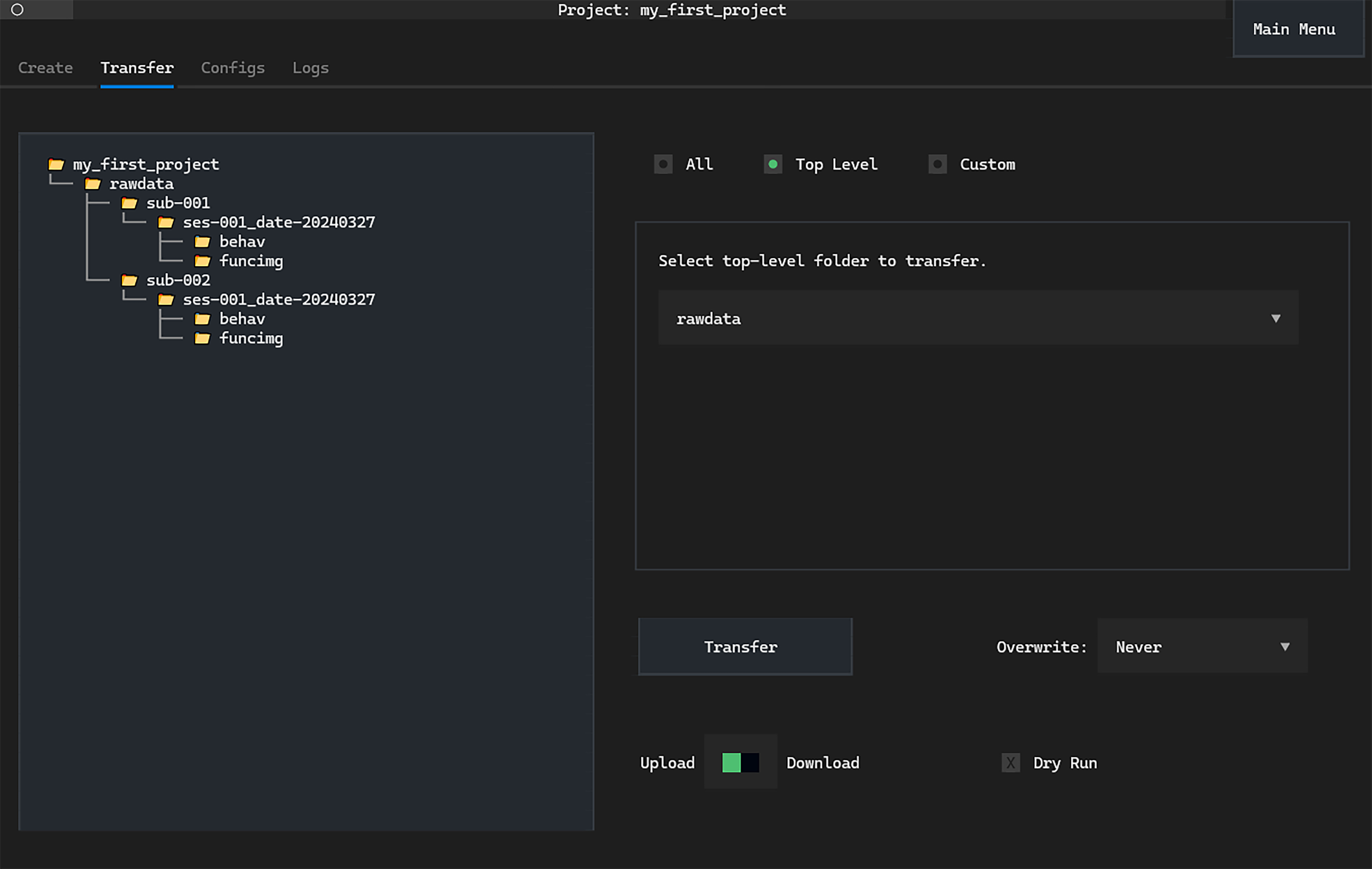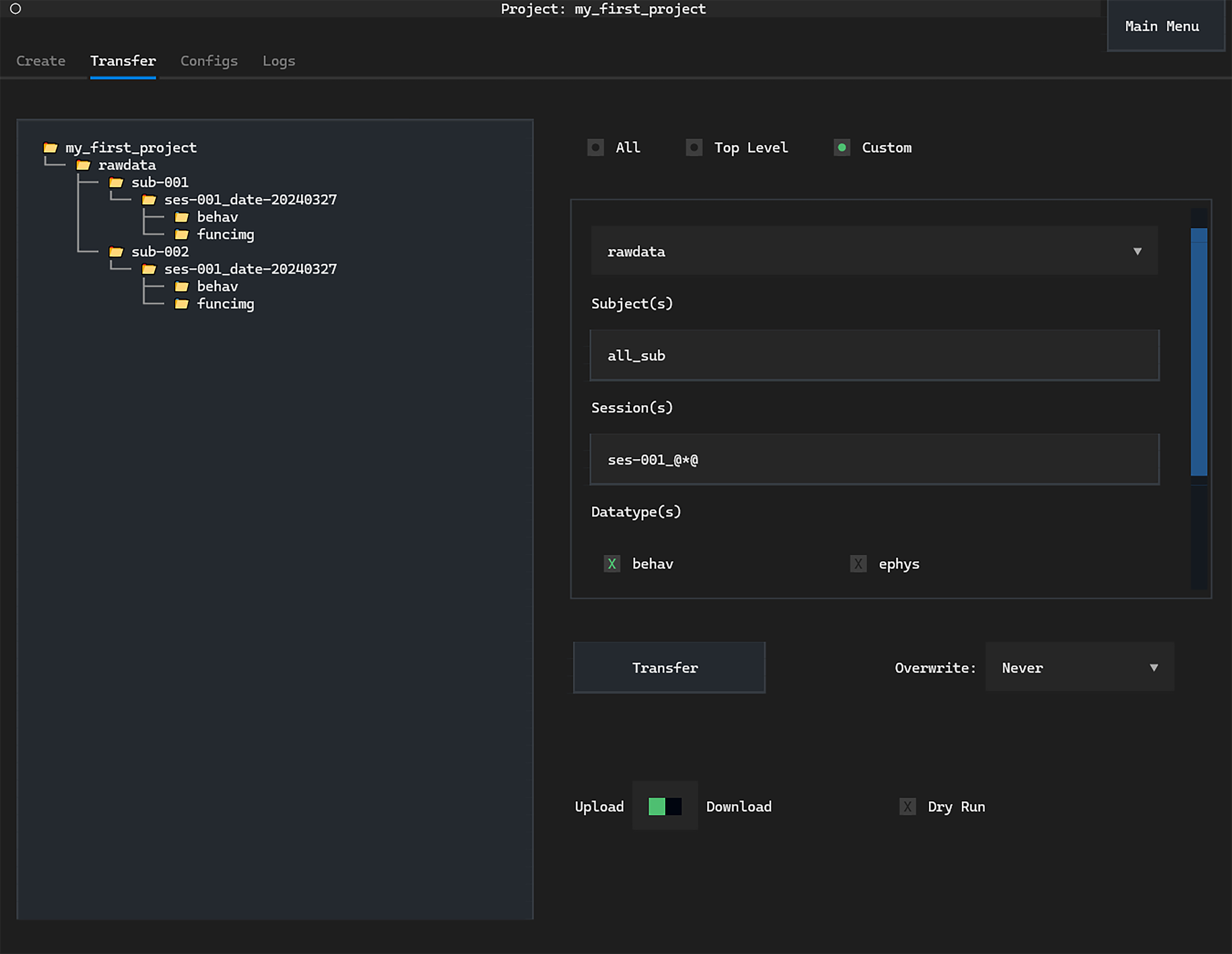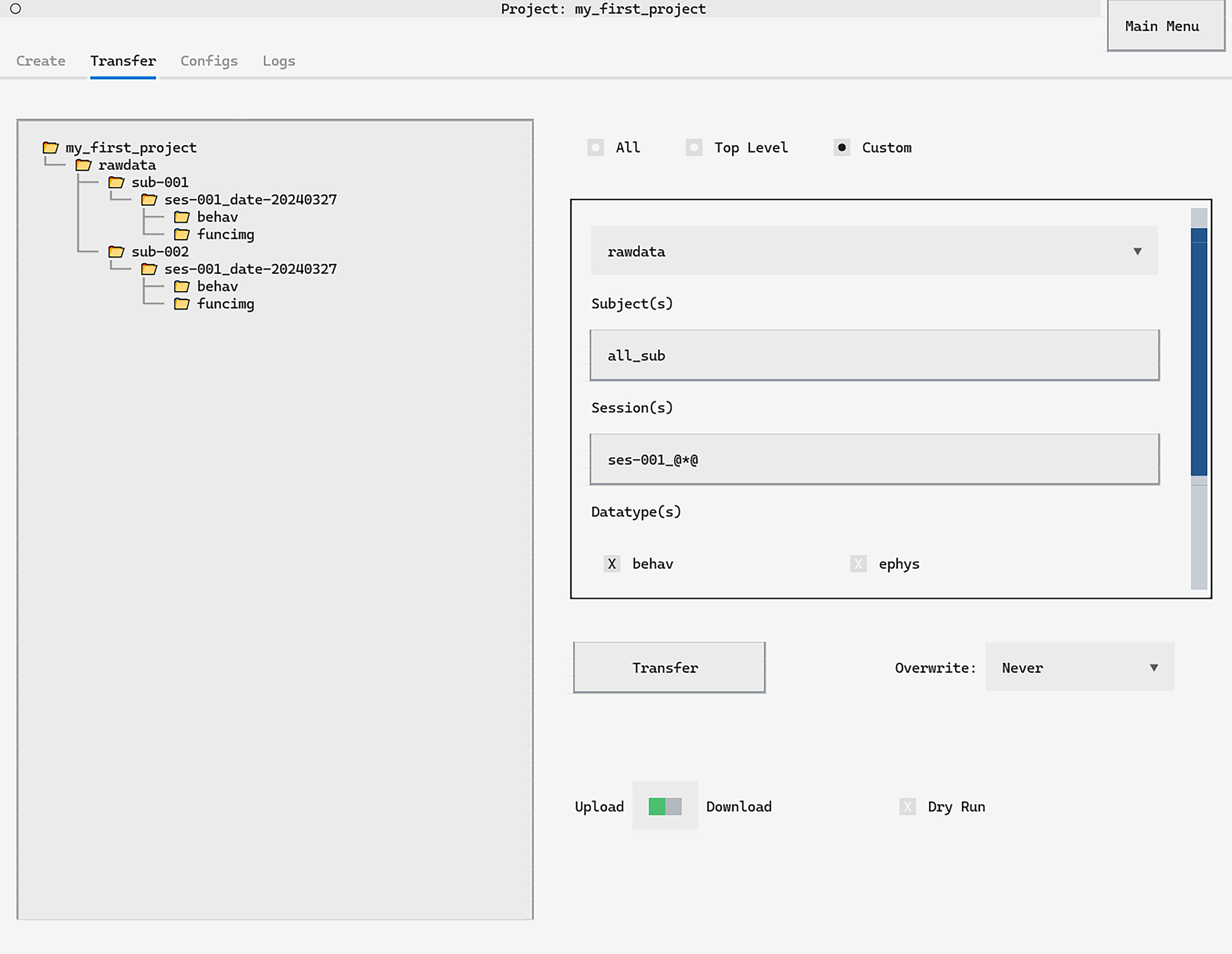 Custom transfers can transfer select subsets of data. For example, you may only want download behavioural data from test sessions for a particular data analysis.