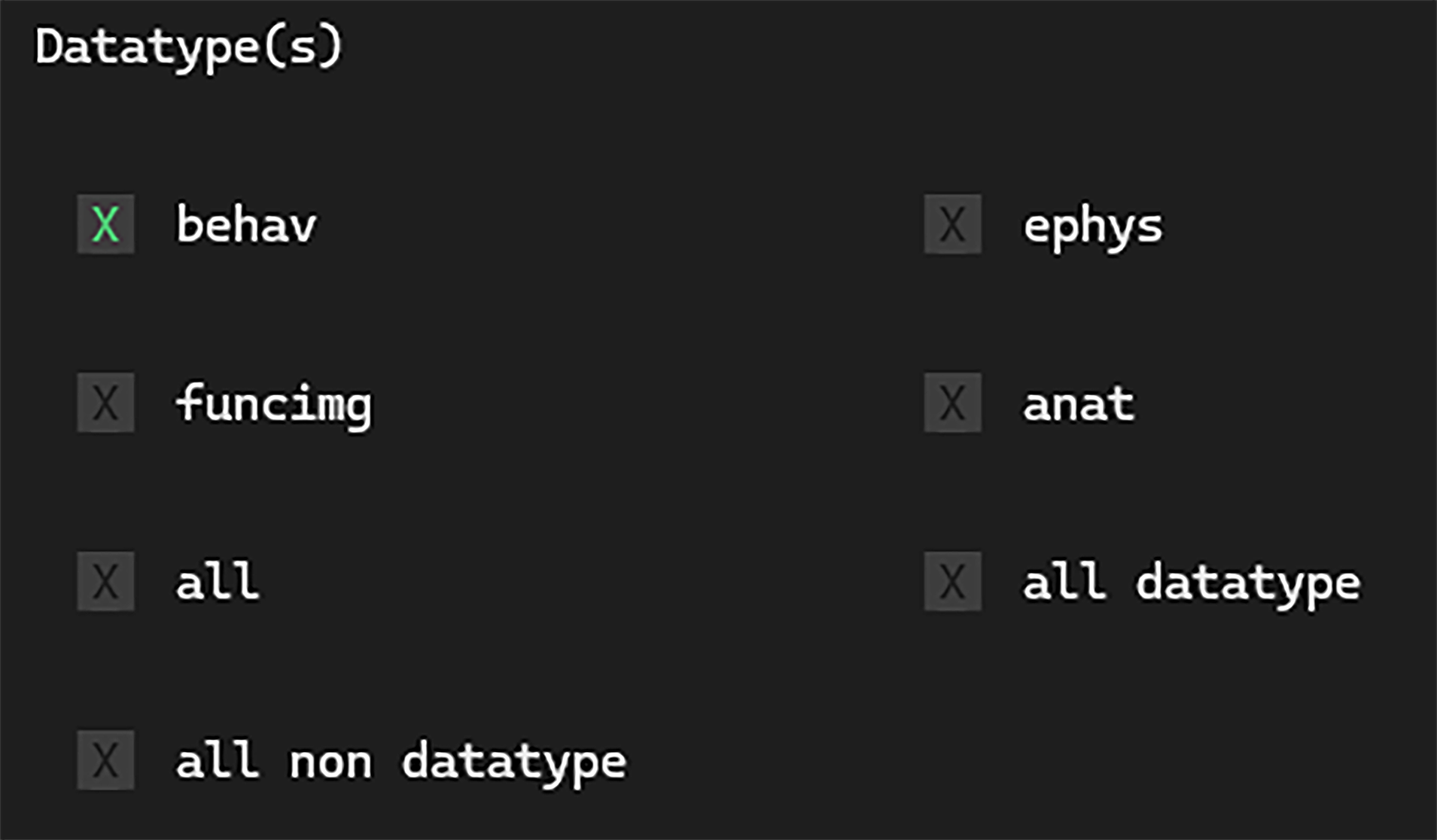 behav,ephys,funcimg,anat) within sessions considered for transfer:all: All files, datatype folders and non-datatype folders will be transferred.all_datatype: All datatype folders will be transferred. Files and non-datatype folders will not be transferred.all_non_datatype: Files and non-datatype folders will be transferred. Datatype folders will not be transferred.