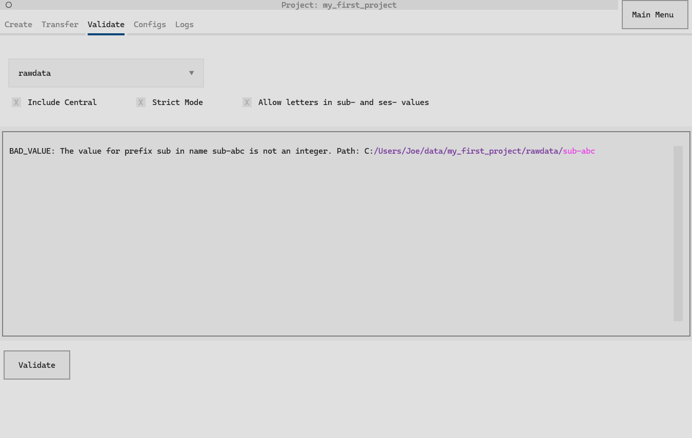 In a set-up datashuttle project, the Validate tab